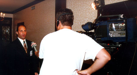 The key, as I learned from Jerry, is to tape the action from several different angles (six cameras in all) and take all the raw footage back to the editing room. During this “post-production” phase, it’s common to find that that one of the camera angles usually captures a particular serve, shot, or even an entire rally better than the others. In building a “master tape” (using tape from all the cameras) you continually select and paste down the best footage available for every rally. After “building the show,” a complete master tape clearly shows the ball during every rally. Of course, viewers can always replay a rally in slow motion to add even more dimension to the broadcast. In addition to learning all this cool stuff about “producing,” I realized that this is just the tip of the iceberg … racquetball can be televised even better! The proper way to go about it is to hire a professional cinematography group to test every possible variable - from the color of the walls, ball, and floor - to various lighting techniques and hidden cameras for new and improved angles. This type of study would produce an even better technique, which could then be maximized with high definition TV. As HDTV technology becomes more widespread in the U.S., televised racquetball would reap the visibility benefits of significantly increased numbers of pixels captured by higher resolution digital taping equipment. So now you know all about producing a racquetball show for TV. But how do you get it on the air? This was another entirely new education “adventure” for me, but what I learned is actually quite refreshing. I’ll start with the answer and then work backward. The bottom line: Almost anything can get on television … all it takes is $$$. Now that you know the truth, let’s talk about why. |