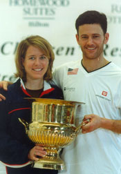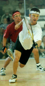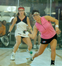 (shown in back court) was attempting to capture her first pro title ever – and on racquetball’s largest stage. The first game was tight throughout, with both players playing conservatively. After two service changes the score was 5-5, after four changes 11-9. Wachtel was forced out of her trademark hard-Z serve by Rice’s persistent offense attack, but had some success with a difficult nick lob serve to keep the game even. “She kept cutting off my drive Z with her forehand,” explained Wachtel. “I knew I had to keep it to her backhand so I started with the lob serve.” Rice regained the serve trailing 12-13 and quickly gave Wachtel a game point. At 12-14, a great rally ensued, with Rice making two diving gets to keep the match going. Wachtel took game one 15-13 on the next rally, getting a crack-out from an errant passing shot. Rice, still showing the impact mark from the preceding day’s shot to the chin, came out in game two drive serving. She knew that she needed to be more aggressive and control the flow of play. Drive serves into the glass scored her some quick points, but Wachtel’s superior front-to-back movement forced Rice to take low-percentage shots. Play remained even in the second, with neither player really able to break away and take a commanding lead. Rice stretched the lead to 10-7 on Wachtel’s serve after winning a terrific rally. Wachtel regained the serve down 12-13 and needed a couple of big points. But Rice got a quick service return winner for 14-12 and then a quick skip for game two, 15-12. With the match now tied at one game each, Wachtel served first and jumped out to 5-0, marking the biggest lead of the match. Jackie fought right back though on her own serve, winning four straight points and eventually tying the game at 8-all. At 10-10, Wachtel served again and showed Rice a new service look; a backhand wallpaper serve that defied short hop returns. The serve turned out to be very effective and Wachtel took 4 of the 5 points on her serve to get a game point at 14-11. Wachtel then took game three off Rice’s first serve for a 15-11 win. Rice started the fourth with big serves to stay in the final, and Wachtel came out hot again. Up two games in the match and confident in her ability to return Rice’s serves, Wachtel jumped ahead to 6-4. A strange rally followed, in which an attempted ceiling ball by Jackie looked as if it would leave the court on the fly, but instead clipped the top of the back wall of the portable court and forced Wachtel to scramble to the frontcourt just to retrieve the shot. Rice put away the pass and the crowd shared the players’ amusement. With Wachtel serving up 8-7, Rice called a carry on herself, a tough call in a crucial situation. Back on serve, Rice hit a tough shot off the back wall to get to 10-11, but Wachtel’s service return game continued to score points for her. Wachtel got the serve back ahead 14-10 and needed just one point for the biggest win of her career. A quick look into the gallery showed husband Chris Wachtel and mom Gerri Stoffregen (who had flown in from Cincinnati just for the final) looking awfully nervous as Kerri served for the championship. A quick rally, one last kill shot, and Wachtel won it all. Her amazingly consistent passing game was just too tough for the former champ to overcome. “Kerri just played awesome, she deserved to win,” a dejected Rice said after the match. “She deserved to win.” “My goal this year was to win a pro stop, just one,” Wachtel said upon her victory. “It just happened to come at the biggest tournament of the year. Now I am going to have to go home and re-think all of my goals.” |