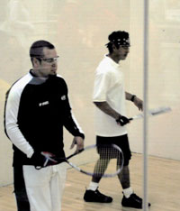 Players traveled from all over New York State as well as from places like Washington and Massachusetts. The Men's 30+ division played out as expected with number one ranked local Syracuse favorites Tim Kirch and Steve Hachey limiting the Rochester team of Tom Mastrodonato and Jim Abraham to scores of 9 and 8 in two straight games. Many top ranked teams would topple however as the drama of the event unfolded. In the Men's 40+ division, top ranked Fred Klemperer and Jim Rougeux fell in a tiebreaker to the number four-ranked team of Phil Defalco and Stu Feder. Klemperer and Rougeux would hold their opponents to 10 points in the first game, struggle in the second game and only make it to 7 points in the third game. Second ranked team of Craig Sambor and Tom Rahn would survive to the finals by beating the number three seed of Reinhart Zimmerman and Nick Legrett. That crowd-pleasing match would come down to 10-10 score in the tiebreaker before Sambor and Rahn would close it out by scoring the final point. In the final match, the righty-lefty combo of Defalco and Fader would play some of the most powerful shots they could to keep pace with their opponents. However, the pace was too fast for the Long Island team who had just finished playing in their other final. They would only score 9 and 11 points in the first two games. Things would go as anticipated as the rankings proved true in the Men's C division with one of the father-son teams emerging in second place. Phil Markham and his son Chris would challenge Robert Waldman and Robert Katz to the title match. The Markham family, who hail from Herkimer, would provide an exciting match against the older pair from Long Island. In a "breath taker" game, the four would work their way to a 14-14 score before dad and son pulled ahead with the winning point. Game two was the same as both teams once again found themselves in a 14-14 dramatic tie. Although in the early part of the game, Markham and Markham pulled out to a 9-2 lead. Now it was Waldman and Katz pulling out the go ahead win to send this final into a third match. Waldman and Katz, both over 66 years old, would rely on high Z's and ceiling balls to control the pace on their way to an 11-5 victory. Another Long Island duo of Defalco and Feder were also successful in earning the title for the Men's B division. They would shut down the athletic crowd pleasing playing of Dave Calhoun and Jim Feola by limiting them to only two and 3 points in both games. In the lower bracket, Rick Stone and Mike Alvaro from Elmira, would tangle with Steve and Scott Manship, another father and son team from Massachusetts. The Manship team gave them a scare by pulling up to 12 points in game one and took game two to 14-14 before falling victim to the Elmira duo. The drama continued as the weekend advanced to the finals for the Men's A division. The number four team of Bill Conz and Chuck Van Horn would come close to an upset as they took the number one ranked team of John Edwards and Rhinehart Zimmerman to three games in the bid for that division final. Conz would rely on his cut-off shots to eventually earn the 15-8 win in game one. In a point for point battle, Zimmerman would begin to fire consistent forehand kill shots as he and Edwards moved to a 15-12 second game win. In game three Zimmerman and Edwards would control and change the tempo, which would lead them to a final score of 11-8. On the lower bracket, number three-seeded Lanny Kinner and Scott Picket defeated number two-seeded Mark Clary and Nick Legrett. The Syracuse, Albany combo of Kinner and Picket would dominate with momentum and restrict Clary and Legrett to 11 and 5 points respectively. In an intense final round, Kinner and Picket would fall in two games to the Cortland-Buffalo combo of Edwards and Zimmerman. In the Mixed division, two members of the Jamaican National Racquetball Team would find themselves in a close match against a Rochester based duo. Number one ranked Jim Green and Donna Renelt would advance to the finals by defeating Mike Osborne and Joy binder 15-10 and 15-2. Number two-ranked John Edwards and Jackie Gopie, members of the Jamaican team, would also advance to the Mixed A's finals with a win over Bruce Mayberry and Wendy Hildmann with scores of 15-9 and 15-6. In the championship round, each team would play to win in what proved to be another point for point battle. Green and Renelt would eventually inch forward to a 15-13 first game win. Gopie, who traveled in from Washington, would move her team forward with a series of Ace serves and earn a chance to go to the tiebreaker with a score of 15-12. In game three, the Jamaicans would continue their run and earn the championship title with an 11-4 win. In another match that wouldn't be good to watch if you had a weak heart, the Men's Open finals proved to be another dramatic point for point "cliff hanger". The top two ranked teams in that division would make it to the final round. Displaying some of New York's best talent, Jeff Hanno and Brian Berlin would launch into battle against Tim Kirch and Steve Hachey. Game one was a point-by-point trade off until the score was 10-10. Hanno and Berlin would freeze their opponents as they moved ahead to a 15-10 win. Game two saw Kirch and Hachey dominate early to a 12-4 lead. Kirch would use the power of his backhand to keep Hanno and Berlin on the move. The lefty righty combo of Hanno and Berlin would struggle for a one at a time point advancement to a 12-14 score before the partnership of Kirch and Hachey would close the game at 15-12. Game three continued the classic textbook struggle of two distinct and different playing types as Hanno worked to control the pace and placement of the ball while Kirch took advantage of his power and speed. Unforced errors would account for some of the points scored in the tiebreaker before Hachey and Kirch would see their power and pass strategy move them to the 11-6 win. |