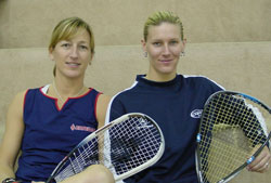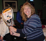 For the rest of the players, this playoff format is a departure from the norm. First, we set up designated teams, distributing all levels of play equally on each team. With a total of ten teams, we divided half into “Team Rajsich” and the other half as “Team Hallander.” This allowed any players needing help with their game to go to their “coach” for advice throughout the day. This was also a way to get to know “your” pro. Singles matches were played to 11, best of three. The Open/A doubles matches were played one game to 21. We included a B/C doubles this year, allowing the lower levels to get some time on the court with a partner, and scheduled it in a shuttle format, five games for ten minutes, with Team Hallander’s playing against Team Rajsich’s. After the rounds were complete, the number one spots played each other, the number two’s played each other and so on. Everyone survived (no one got hit with a racquet or a ball) and a lot was learned in this hour of fun. All day long, there were “Test Your Skills” events with prizes to the most accurate players. Targets were set up to hit with a drive serve, a lob serve, or a pinch, along with many others that Marcia Richards conjured up. Players wonwhatever prize was in the target. By the end of the day, as players were being eliminated, they decided to test their skills on the court with a pro. This event paired you with a pro to play a doubles game. Kersten and Rhonda adapted their games to fit the level of the players, sometimes even playing left-handed. Even though everyone was exhausted, we all managed to drag ourselves over to the nearby Old Chicago for our dinner and awards party. The 85 in attendance at dinner were just another testament to how well this event had gone. Not a soul left without an award for something. Tasha Morris, a professional kick boxer recovering from breast cancer, was our guest speaker, and gave a heartfelt speech that left us all amazed at her recovery. We’d like to thank her for her time and sharing her personal life with us. Not to mention the fact she got on the court and actually played racquetball! She took a few pointers from Kersten and we look forward to her entering the tournament next year. Thanks to all the guys that helped out during the day ... Bruce Burgess, Adam Katz, Dan Davis, Steve Nelson, and Larry Mullen to name a few. They helped run the tournament desk, took pictures, answered any questions throughout the day, ran the pro events and even stepped on the court for a few rallies with Kersten and Rhonda. Their support was overwhelming, along with that of the tournament committee and sponsors, who made the marathon day worth all the effort. We were able to meet many new players and get to know the ones that we’ve seen before. A special thanks to out to LPRA regulars Kersten and Rhonda for sharing their time and talents with Colorado locals. We enjoyed learning more about them as individuals. So the next time you dive on the court and the crowd starts the wave, hopefully it will remind you of the “Racquet for the Cure” and bring a smile to your face. |