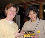 We kicked off with an exhibition match between top-ranked pros Kersten Hallander and Rhonda Rajsich (shown left, L-R), who gave it their all, and didn’t let up for anything. You’d have thought they were playing at the U.S. Open! It’s hard to get a ball past Rhonda, who dove repeatedly to keep the ball in play. Kersten played strong and came through in the fifth game for the win. But the most fun was in the stands, after Jo Shattuck started “the wave” every time one of the players dove!