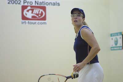 Lori-Jane Powell, seeded ninth, moved closer to bumping Kim Russell out of the eighth spot in the rankings when she defeated her in four games, 15-12, 15-11, 8-15, 15-12. Tenth-seed Susy Acosta got past No.7 Claudine Garcia after an injury forfeit. “I was running to get a ball up towards the front wall,” Susy explained after the match. “I turned around and she was laying there on the ground.” Garcia took the full fifteen minutes allotted for an injury timeout but it wasn’t long enough. When she came back onto the court to give the match another try, her knee couldn’t bear weight and she was forced to forfeit. Although at press time she is seeking a second opinion; the preliminary diagnosis was a torn ACL.