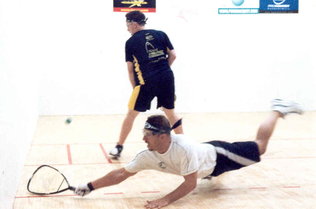 Catalog.com Pro Fest there were those who doubted Sudsy’s capacity to overcome his injuries from last year. There were those who wondered if he would ever be a consistent force on the IRT pro tour again. The people asking those questions were about to get an answer. The challenge started early. On arrival at the Family Fitness and Racquet Club in Broomfield, Colorado, Sudsy was pulled aside by a tournament director. There was a rumor floating round and it seemed only fair for Sudsy to hear it straight up. In a nutshell, some were saying Sudsy’s natural athleticism was working against him. His accomplishments had always come easily. That being the case, he didn’t have the desire, dedication, or work ethic to come back and be a champion. Sudsy conceded he’d heard inklings of the same remarks. Champions love a challenge. It was from this conversation that the “mission” began. The two agreed that Sudsy was to remember those statements before every match; a silent reminder as he stepped on the court. “Has-been” … “quitter” … “not tough enough.” Fightn’ words. Those who didn’t believe, might by the end of the tournament. Qualifying for the Pro draw is always interesting, as top amateur players vie for a spot in the main draw. Big names are a target and a chance for some recognition with an upset. The only one with something to lose is the pro who has to work his way in. And that’s where Sudsy had to start, since his ranking points had plummeted during his recovery through most of last season. Technically, his wins were upsets, but a better term might have been “feeder fodder.” Two qualifying rounds; two quick workouts. From there things got quite a bit tougher. Going into the round of 16, Sudsy had to deal with another early-round hazard of “starting at the bottom” in facing one of the toughest players on the tour, IRT Pro Nationals champ, John Ellis. As you can imagine, it was a grueling five-gamer — (8), 9, (3), 2, 7 — and one of the best matches of the tournament right off the bat. In the meantime the other top seeds, Jason Mannino, Kane Waselenchuk, and Cliff Swain advanced on cruise control. The quarters had Mannino, Kane and Monchik all taking care of business in relatively short order. Sudsy dispensed of Jack Huczek in a straight-game match for adults only. It would appear that Sudsy and Jack don’t bring out the best in each other, and there were as many personal shots taken as those with the ball. Jason took care of Derek Robinson in three, while Kane whupped up on Rocky Carson in much the same way. Where Sudsy had survived a big battle in the previous round, it was Cliff Swain taking on that chore in the quarterfinal. His nemesis was fellow-southpaw and USRA men’s open champion Mike Guidry, who showed that he has the skills to take anyone down in the right time and place. And it was darn near “right” in both ways, as he gave Cliff all he could handle. When the dust settled it was Cliff still standing with a 3, (8), (1), 6, 5 victory. At this stage of the game you’d think things would get much tougher. A semifinal with three solid Hall of Fame prospects, and a kid who might eventually be best of the lot? Yep, that’s what you’d think. Against Canadian wunderkind Waselenchuk (for the big match that wasn’t) Mannino took control early and often, to win quickly, 5, 6, and 3. On the other side Sudsy’s personal mission stayed on track. Sudsy and Cliff have only faced each other about a 100 times this century, and generally you can be guaranteed a dogfight. This time there was no abuse, no antics. Sudsy’s game had been picking up pace and Cliff appeared not to have recovered from the Guidry marathon. With the two vastly different approaches, Sudsy ran away with the win, 2, 8, and 6. Thus … the finals between Monchik and Mannino. Good friends, good players, neither wanting to give the other an inch. Both willing themselves to get seemingly irretrievable shots, both giving their all. It was a classic battle. The big difference? One was on a mission, one wasn’t aware that there was a mission. It was only fitting that it would go back and forth in the first four games, and end with the last game going down to the wire: the 13-11 final went to Sudsy. As friends will be, both were gracious in their assessment of the match and their opponent’s skill. The mission was over. Objective completed. Sudsy was back on top and he had done it the right way — he let his actions speak louder than words.