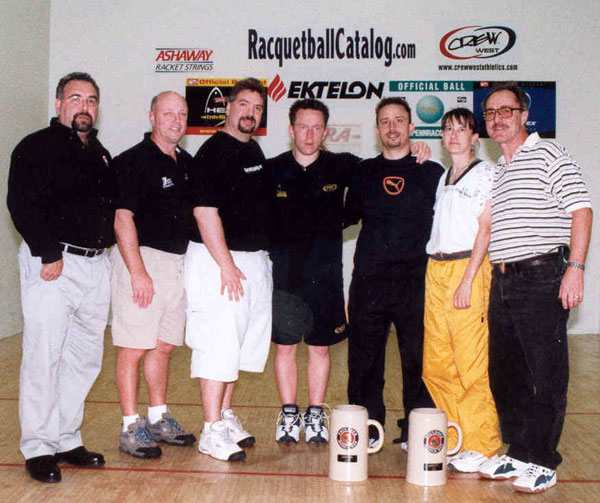 ![]() L-R: IRT Commissioner Dave Negrete; RacquetballCatalogs' Rick Sorenson & Steve Parker; finalists Monchik & Mannino, Family Fitness manager Johanna Shattuck & owner Jurgen Denk. |