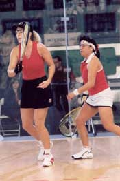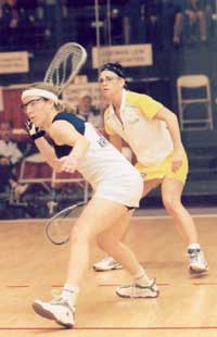 Jackie won the toss, served first and moved ahead 2-0, while Cheryl dealt with some jitters and visibly grimaced after one loose shot gave Jackie an easy put away. But Cheryl gritted through nerves and evened the first game at 4-4, using a nice backhand half-lob along the side wall to force Jackie into playing defensively. Cheryl’s strategy was to slow down the more aggressive Rice, and it showed as she gained the upper hand in several ceiling-ball rallies to take the first game 11-5.