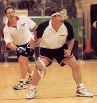 Bret Harnett earned the top seed and, although he hasn't played much competitive racquetball since retiring from the pro tour, still looked to be in top shape. He faced Gregg Peck, who has stayed active in racquetball on the coaching side, leading the 2001-2002 U.S. Junior Team to another world title. Gregg held his own against the lefty, but Bret's power was too much throughout the 15-11, 15-13 match win.