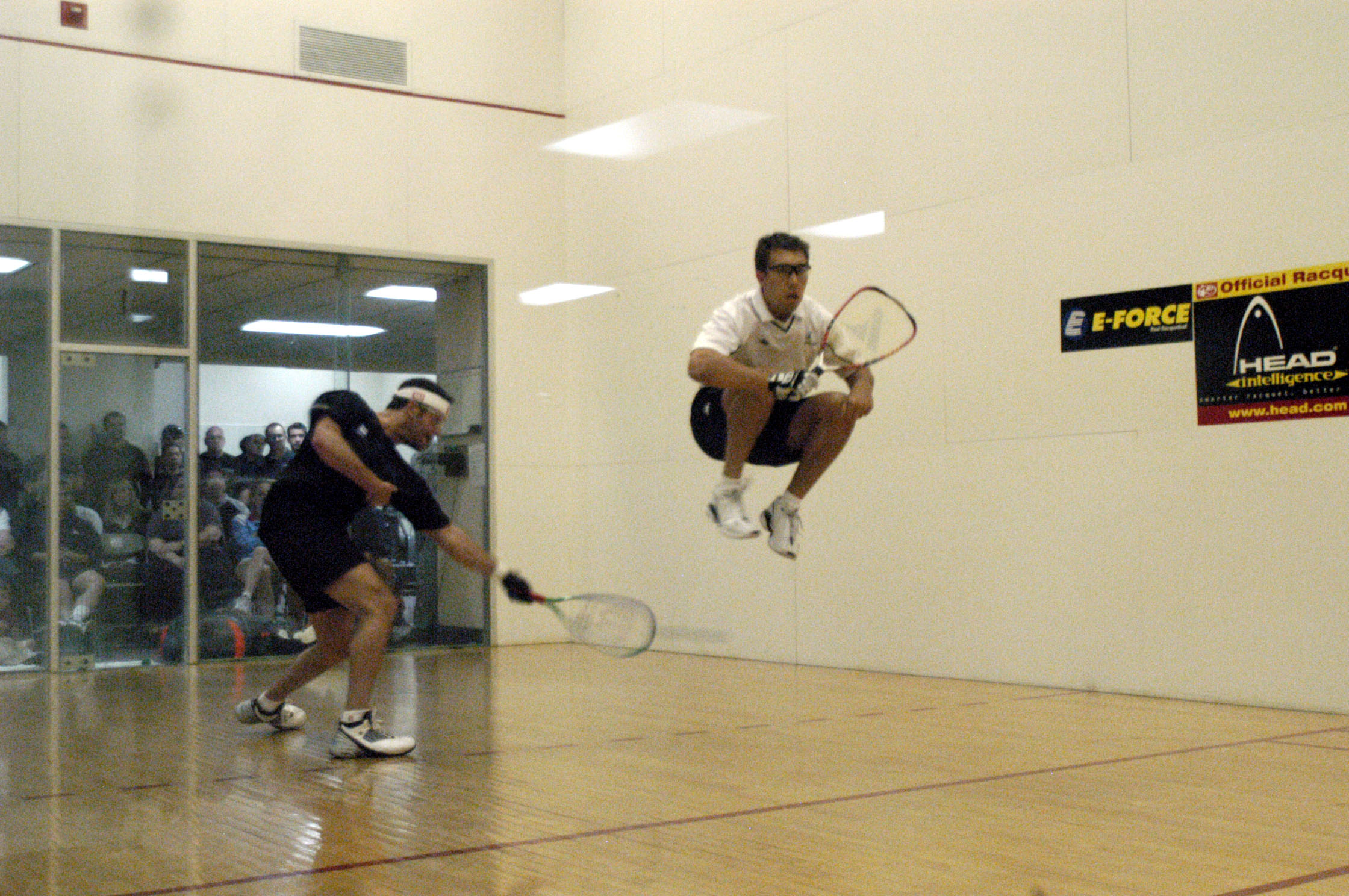 Baltimore's Jamal Harris lost to former national champ Mike Guidry, Arlington's Pete Appel lost to Mike Dennison, the home club's pro Victor Zambrano lost to California's Chris Crowther, and tourney sponsor Stan Golob upset two players to face Josh Tucker. Local pro Dan Fowler had a more difficult matchup, facing down North Carolina's Brent Walters. DC's other "local" pro Dan Llacera faced down Norfolk's Brian Pierce, an upset qualifier over local kid phenom Travis Woodbury. Derek Robinson handled fellow travelling pro Rodrigo Urzua. The match of the round, by far, (and the only one not to be a 3-game breeze) was North Carolina's Mitch Williams taking on Ohio's Shane Vanderson. These two regularly face off in big game situations, both being nationally ranked in the Open. They faced off in one of the later matches (reminiscent of Mitch's epic 11-9 5th game qualifying loss last year to Guidry). Mitch came out firing, blowing Shane away in the first two games. With game three even up at 7-all, Mitch played three loose points to quickly give Shane a 10-7 advantage and eventually the game. Mitch jumped out to a 7-2 lead in game four, only to let a shaky serve and plenty of foot-faults let Shane get back into the match. He scored nine straight to take game four, 11-7. Mitch's confidence looked bad heading into a decisive fifth game. Mitch's demeanor on the court can only be described as "jesterly," making comments, being expressive and generally entertaining the crowd. Shane is a model of concentration, keeping an even keel no matter what the situation. A contrast of styles set off in game five. Mitch looked calmer than he had in the end of game four, where five straight service errors eliminated any possibility of winning. He hit a couple of aces, took advantage of errors by Shane to jump to a 3-0 lead. He was up big when Vanderson came storming back. At 9-5 a huge call went against Shane ... a clear avoidable against Mitch gave him a critical hinder replay ... which he parleyed into three straight points for 9-9. Shane then flat-rolled a drive serve return (also questionable ... half the spectators said skip, half said phenomenal shot) and got a point for 10-9. At match point against, Mitch hit a backhand splat roll out from 39 feet; the crowd was amazed. Back and forth, Shane had at least three serves at match point with Mitch making one spectacular diving get after another. In one rally, Mitch dove towards one ball, then slipped getting up towards the next passing shot, and resorted to literally crawling the last three feet to retrieve the shot. Finally, Mitch had 10-10 and was out of imminent danger. He quickly got a point for 11-10, and then Shane hit an unbelievable service return off one of Mitch's missile drive serves ... just as the crowd was saying, "phew that's unreturnable" Shane pinches out a perfect backhand on a 160-mph serve. Back and forth some more, before another tough call went against Shane (a short serve that clearly looked good). Shane looked rattled, especially when Mitch served a ball in pretty much the same spot. Soon after, match point came and went, and Mitch had the 13-11 tiebreaker win: #24 Mitch Williams (NC) def. #18 Shane Vanderson (OH) 4,4,(9),(7),11 ROUND OF 16: Friday Afternoon Fowler def. Mannino in four: Mannino, playing with a heavy heart after a death in the family earlier this week, loses early and gives Dan his second straight quarterfinals appearance. This is great news for Dan, who has slipped to #20 in the rankings after sitting out much of last season. As is normal, the reffing was controversial, and resulted in some pretty bad sportsmanship being displayed. Bad enough to warrant future actions? Derek def. Ellis: Ellis's luck continues to haunt him, and his slide down the rankings continues. An injury to his back forced him out of his round of 16 match with Derek. I spoke with Ellis afterwards, and basically his retiring was a precaution, and that after extensive stretching his back feels fine. No long term damage. Kane def. Mitch: Fans hoping for a rematch of last year's thrilling US Open matchup between these two hard-hitting leftys were left wanting, as Mitch, totally spent by his 13-11 nailbiter last night, couldn't keep up with the fresh Kane. Rocky crushed Guidry 3,3,6. Rocky really looks great this tourney thus far. Monchik, Swain both cruise to set up a great quarterfinal matchup. Huczek handles Tucker in three straight. Alvaro defeats Llacera in the toughest match of the round, taking a fifth game 11-4. QUARTERFINALS Rocky spanks Fowler 1,9,2. Fowler left it all on court with Jason the night before, and looked flat against Rocky. Rocky continues to impress; the crowd thinks this may be his tourney w/ both the #1 and #2 seeds out. Jack vs. Alvaro: Jack wins in three straight, not as close as scores suggested, 2-8-10. Cliff vs. Sudsy: You can't ask for a better quarterfinal matchup than these two. A rematch of dozens of IRT finals over the years, including last year's US Open. Sudsy has dominated Cliff as of late, taking the last ELEVEN straight matchups in their career. Cliff hasn't beaten Sudsy since the New Orlean's event in 2000. That's hard to believe, but its true. Cliff wins first when Suds doesn't like a call. At 9-9, Sudsy is visibly upset at a call that didn't go his way, punching the backwall glass in anger after dropping the game. Cliff rolls in the second second game, 11-2. At 2-0 in the third game down, Sudsy walked off the court, retiring due to "injury." Afterwards, the pros watching said that Cliff hasn't played this well in two years. Perhaps he's out to set straight an omission in his career: he's never won a pro stop at this club. Cliff breaks his drought against his rival going away. SEMIFINALS Rocky vs. Cliff: Rocky never got into this game, not because of concentration or apathy, but because Cliff is playing even better than yesterday. Rocky absorbs a donut in the second game and can do little with Cliff's crisp serve