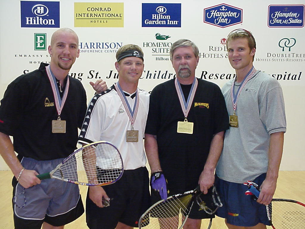 The St. Jude Pro-Am Doubles Tournament opened the Hilton U.S. OPEN on Tuesday evening, with thirty-two of the world’s best pro players pairing up with amateur partners — each of whom had donated $250 for the opportunity to compete side-by-side with the best in the sport. This year’s St. Jude Pro-Am Doubles title went to the team of #7 ranked pro and current amateur national champion Rocky Carson, of Orange County, California, and his local partner Mike Jamison of Memphis. They defeated Houston’s Doug Eagle and Landon Pilant, a member of the University of Memphis racquetball team.